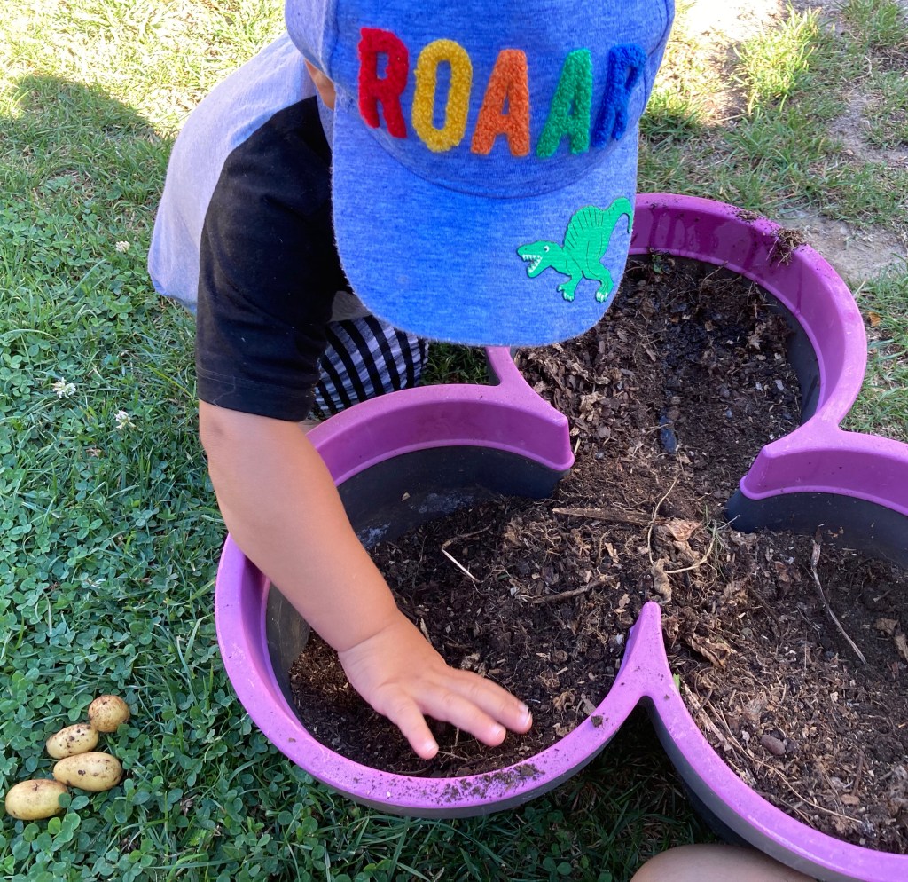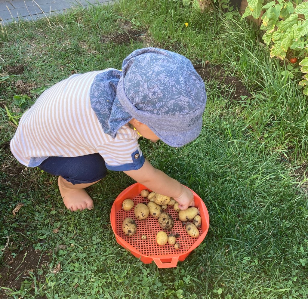 Als die Blätter der Kartoffelpflanzen verwelkt waren, machten wir uns Ende August ans Ausbuddeln – eine richtige Schatzsuche. Ausgerüstet mit Schaufeln, aber vor allem mit den Händen gruben wir die Töpfe um.