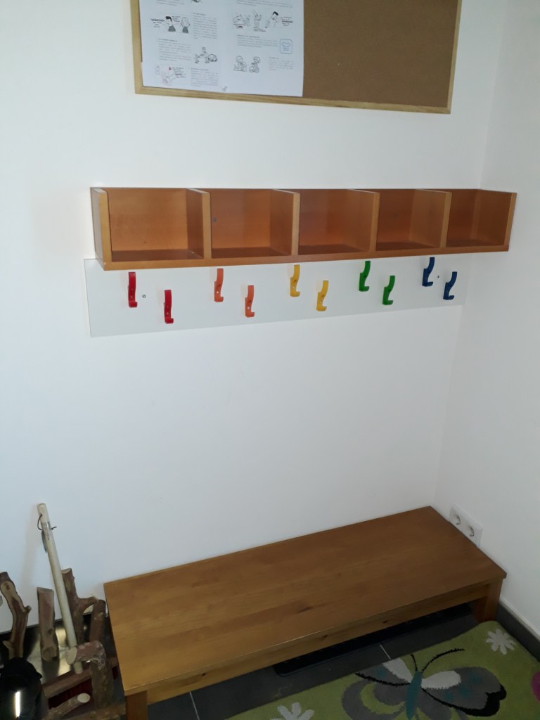 Im Eingangsbereich lädt eine geräumige Garderobe mit niedriger Bank zum selbstständigen An- und Ausziehen und zum Verstauen von Schuhen, Jacke, Mütze & Co ein. Ebenfalls im Flur befindet sich ein gemütliches Plätzchen zum Wickeln und ein Schrankfach für jedes Kind.