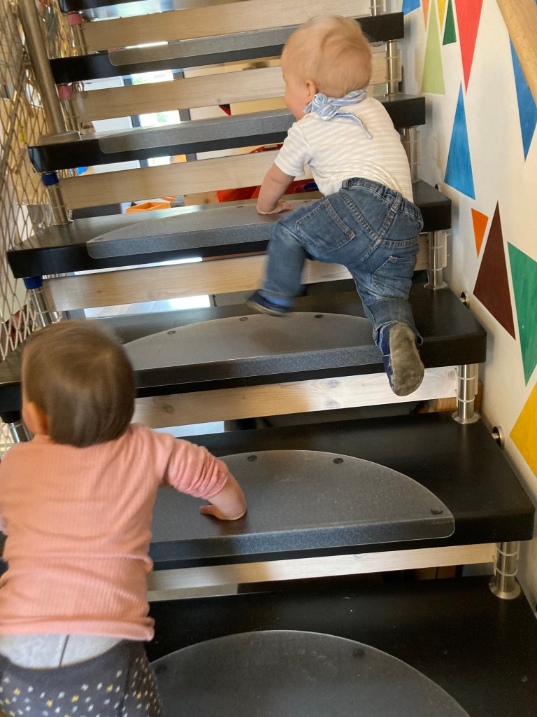 Zur Mittagsruhe gehen wir gemeinsam die Treppe nach oben. Zum Zähneputzen, Ausziehen und Wickeln oder Toilettenbesuch haben wir im größeren Bad oben viel Platz.